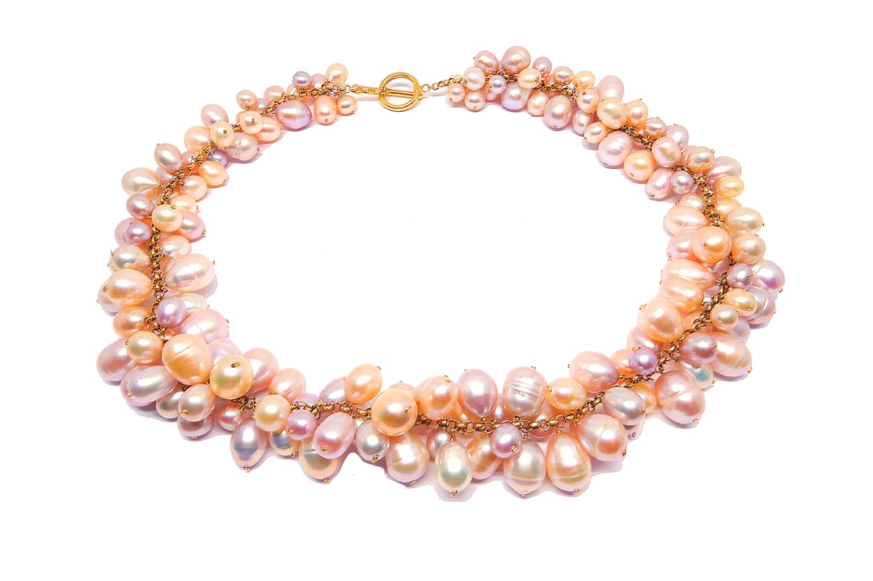 Art.nr: 04-745. Rosa sötvatten semi-barock pärlor, lås i gulguld 18K. Pris: 19900:-
