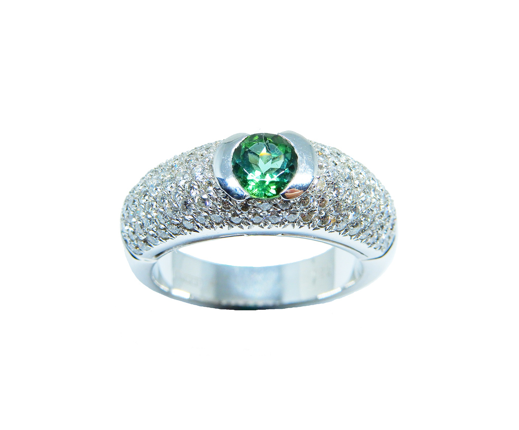 Art nr: 044245. Vitguld 18K, pavé dia 1.15ct TW/VS, Grön "natural" turmalin 0.68ct.