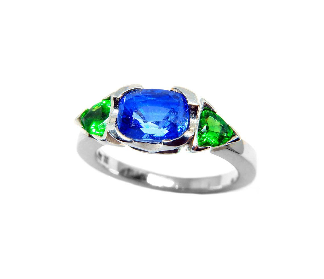 Art nr: 074579. Vitguld 18K, safir 1.84ct, 2 tsavoriter.