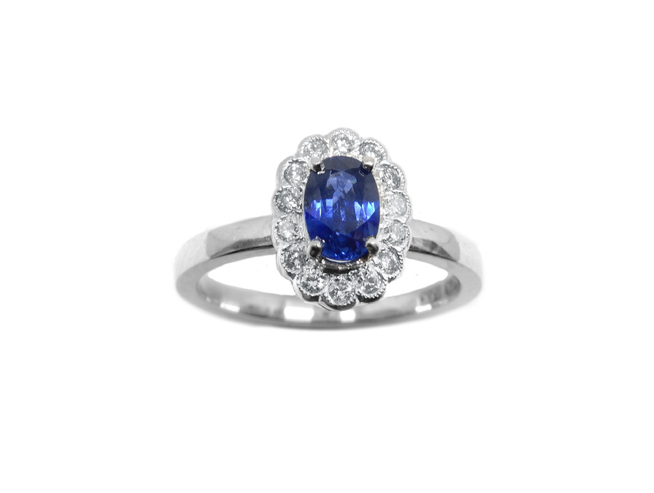 Art nr: 175240. Vitguld 18K, dia 0.14ct W/SI, safir 0.66ct.